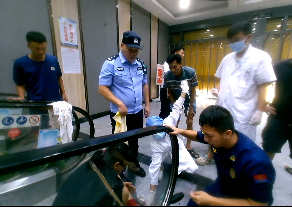 2025年8月5日15時(shí)許,遂溪縣公安局城月派出所民警接到城月鎮(zhèn)政府工作人員電話求助,稱該鎮(zhèn)某商場(chǎng)一名小孩被卷到扶手電梯里,需要出警協(xié)助救援。接報(bào)后,民警第一時(shí)間趕到事發(fā)現(xiàn)場(chǎng),積極配合先期到達(dá)的消防救援人員展開施救。為保障救援順利進(jìn)行,民警立即疏散在場(chǎng)無關(guān)人員。