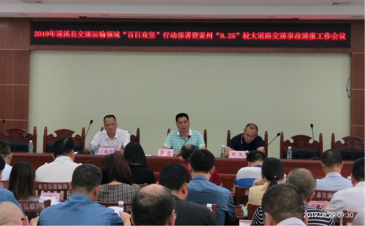 2019年8月29日上午,遂溪縣交通運(yùn)輸局在局一樓會議室,召開了2019年遂溪縣交通運(yùn)輸領(lǐng)域“百日攻堅(jiān)”行動暨雷州“8·25”較大道路交通事故通報(bào)工作會議,縣交通運(yùn)輸局副局長羅益(分管安全工作)、縣交通運(yùn)輸局副局長鄭美、縣交通運(yùn)輸局黨組成員王海周、各股室負(fù)責(zé)人、各執(zhí)法中隊(duì)負(fù)責(zé)人,局屬各單位及縣各運(yùn)輸企業(yè)主要負(fù)責(zé)人共52人參加了會議,本次會議由羅益副局長主持。