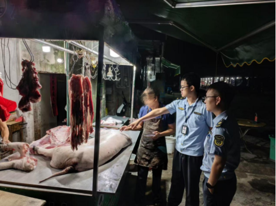 凌晨,靜謐的鄉(xiāng)村仍在沉睡,樂(lè)民農(nóng)貿(mào)市場(chǎng)的豬肉交易區(qū)已亮起燈火?!澳愫?,請(qǐng)出示該豬肉的‘兩證兩章’?!眻?zhí)法人員的聲音打破檔口的寧?kù)o。