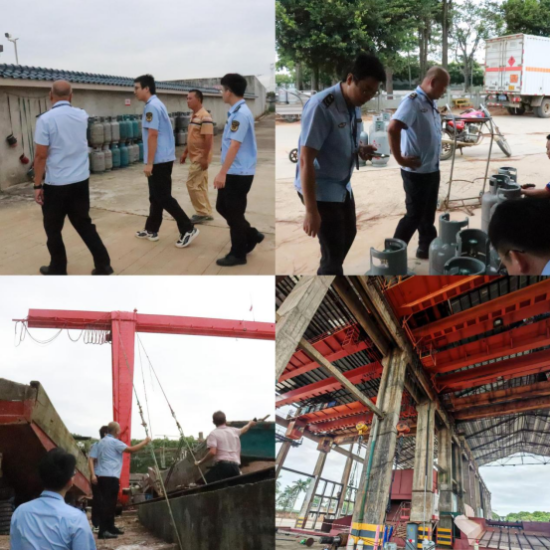 二、緊盯特種設(shè)備,嚴(yán)守安全底線。檢查組以轄區(qū)內(nèi)大型起重機械、危險化學(xué)品儲罐為重點,深入轄區(qū)燃?xì)庹?、船廠、糖廠等特種設(shè)備使用單位,聯(lián)合企業(yè)安全管理員排查燃?xì)夤艿烂芊庑阅芘c充裝設(shè)備狀態(tài),防止燃?xì)庑孤缓瞬槁短炱鹬貦C械加固情況,要求起重機械立即停機,收回吊臂,撤離工作人員,加固設(shè)施設(shè)備,筑牢特種設(shè)備安全屏障。