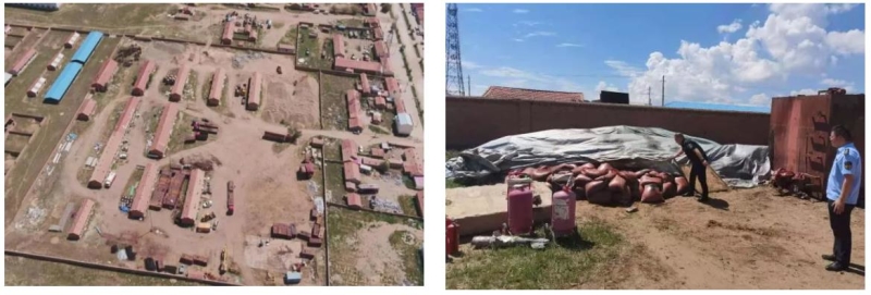 2021年7月29日,內(nèi)蒙古錫林郭勒盟生態(tài)環(huán)境綜合行政執(zhí)法支隊(duì)接到群眾舉報(bào),反映有人在鑲黃旗巴音塔拉鎮(zhèn)舊學(xué)校院內(nèi)非法收集廢棄儲油罐和油污造成環(huán)境污染。錫林郭勒盟生態(tài)環(huán)境綜合行政執(zhí)法支隊(duì)立即派員前往現(xiàn)場進(jìn)行核查,執(zhí)法人員通過無人機(jī)航拍發(fā)現(xiàn)鑲黃旗巴音塔拉鎮(zhèn)舊學(xué)校院內(nèi)南側(cè)和西北側(cè)堆存有大量廢棄油井的配套設(shè)施設(shè)備(抽油機(jī)、儲油罐、管線等)、含油碎管料等拆解出來的零件和油泥(人工裝袋),現(xiàn)場未采取任何污染防治措施。