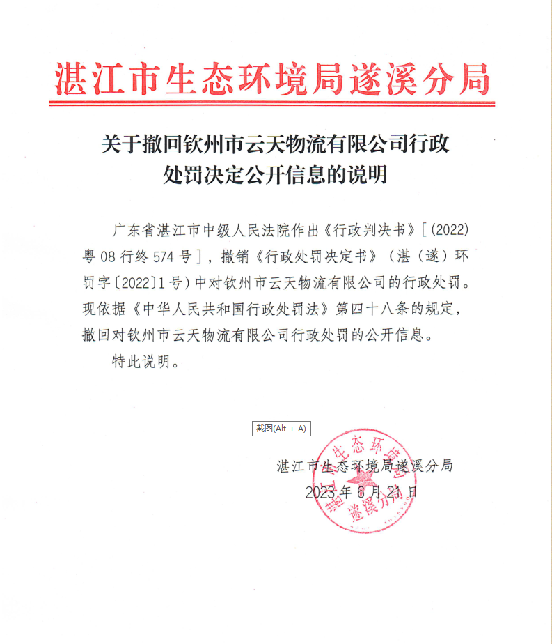 關(guān)于測繪欽州市云天物流有限公司行政處罰決定公開信息的說明