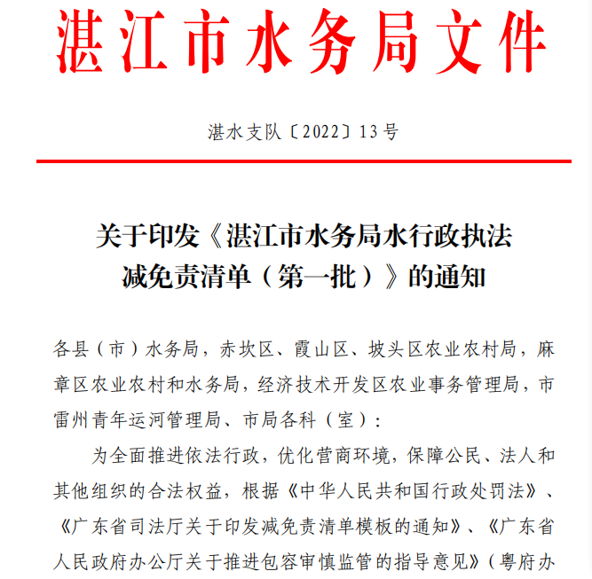遂溪縣水務(wù)局適用《湛江市水務(wù)局水行政執(zhí)法減免責清單(第一批)》