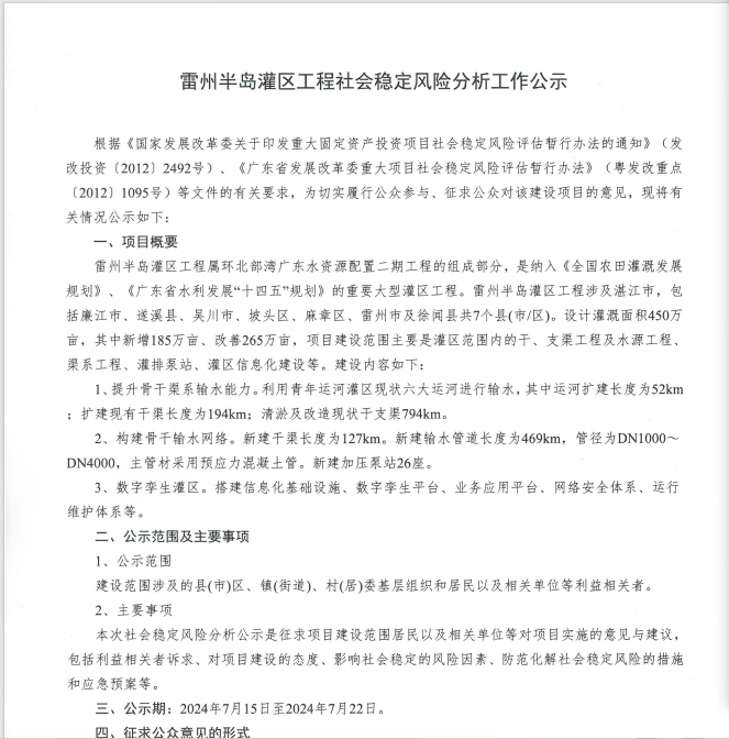 雷州半島灌區(qū)工程社會(huì)穩(wěn)定風(fēng)險(xiǎn)分析工作公示