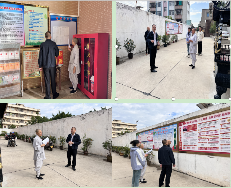 調(diào)研組一行來到城月鎮(zhèn)天華庵,現(xiàn)場察看了宗教場所的環(huán)境衛(wèi)生和上墻宣傳內(nèi)容,重點了解宗教活動場所規(guī)劃布局、財務(wù)公開、管理制度、消防安全、公共衛(wèi)生、日常及大型宗教活動管理等情況,并與宗教界人士進行研討和交流,聽取意見建議。