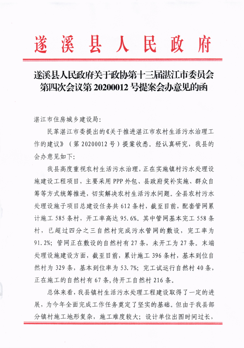 遂溪縣人民政府關(guān)于政協(xié)第十三屆湛江市委員會第四次會議第20200012號提案會辦意見的函