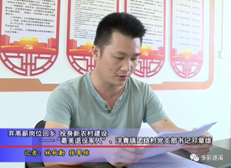 鄧章雄在2011年12月從部隊退役。2019年,他放棄總經(jīng)理優(yōu)厚的待遇,回到家鄉(xiāng)擔任村黨支部書記,帶領(lǐng)村民開展社會主義新農(nóng)村建設,奔康致富。鄧章雄一直堅持著軍人的作風,吃苦耐勞,助人為樂,處處以一個共產(chǎn)黨員的標準嚴格要求自己,積極投身工作中。