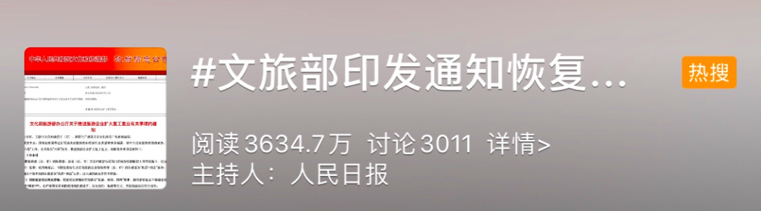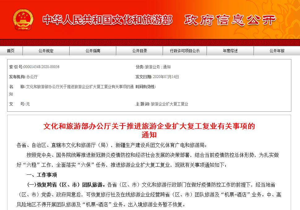 國(guó)內(nèi)跨省游恢復(fù)開(kāi)放7月14日,文化和旅游部辦公廳印發(fā)了《關(guān)于推進(jìn)旅游企業(yè)擴(kuò)大復(fù)工復(fù)業(yè)有關(guān)事項(xiàng)的通知》(以下簡(jiǎn)稱《通知》),明確恢復(fù)跨?。▍^(qū)、市)團(tuán)隊(duì)旅游,出入境旅游業(yè)務(wù)暫不恢復(fù),景區(qū)游客接待量由最大承載量不得超過(guò)30%上調(diào)至50%。恢復(fù)跨?。▍^(qū)、市)團(tuán)隊(duì)游