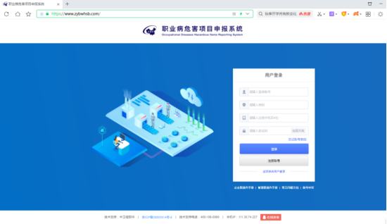 申報網(wǎng)址:用人單位應(yīng)通過新版“職業(yè)病危害項目申報系統(tǒng)”進行申報,申報網(wǎng)址:www.zybwhsb.com (該地址已域名備案),推薦IE11.0以上版本系列瀏覽器,或使用帶有極速模式的瀏覽器,推薦使用360安全瀏覽器,并在極速模式下使用。
