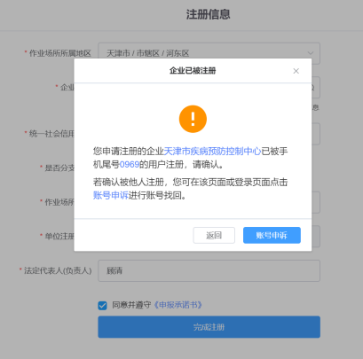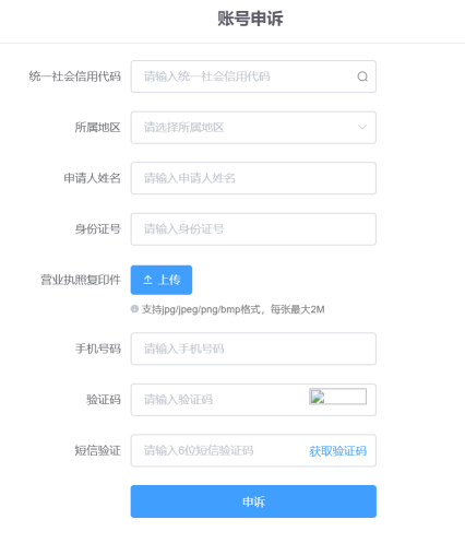 賬號申訴:注冊過程中如提示單位已被注冊或因故造成系統(tǒng)登錄賬號、密碼遺失,原注冊手機號無法使用,可選擇原注冊頁面直接點擊“賬號申訴”,按流程實現(xiàn)賬號申訴解鎖。