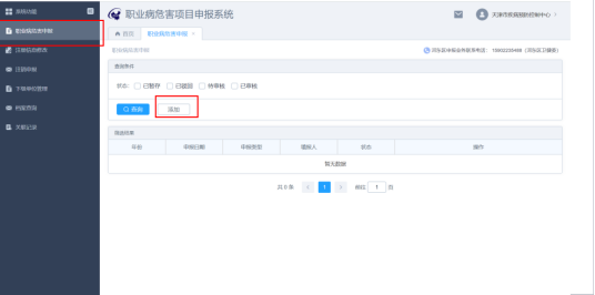 登錄系統(tǒng)后,點擊左側(cè)菜單欄的“職業(yè)病危害申報”模塊,進入管理頁面,點擊添加,進入填寫界面。