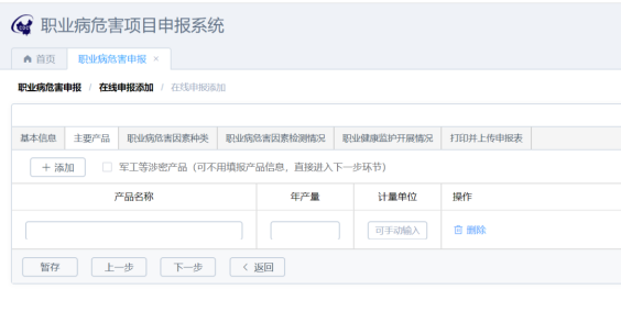 注意:1.如當(dāng)前申報企業(yè)為非生產(chǎn)型企業(yè),如醫(yī)院、飯店等,“主要產(chǎn)品”項名稱及計量單位填“無”,年產(chǎn)量填0。如當(dāng)前申報企業(yè)的產(chǎn)品為涉密產(chǎn)品時,勾選軍工等涉密產(chǎn)品,可不用填寫產(chǎn)品信息,直接進入下一步。