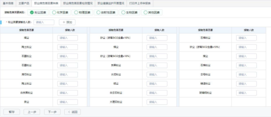 職業(yè)病危害因素種類信息編輯完成后,點擊“下一步”,進入職業(yè)病危害因素檢測情況編輯頁面。