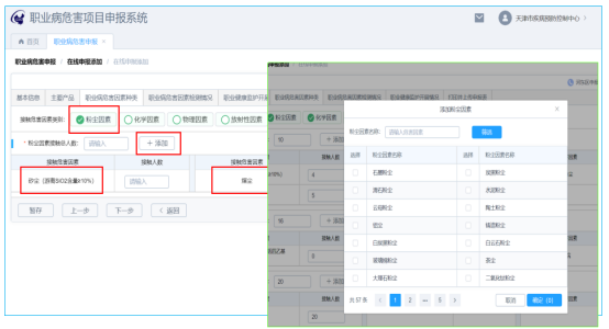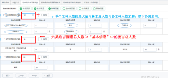 注意:1.此頁職業(yè)病危害因素至少選擇1項;2.每種因素可選擇添加,增加除頁面上顯示的其他職業(yè)病危害因素;3.單類危害因素接觸總?cè)藬?shù)≤基本信息頁面的接害總?cè)藬?shù);4.單個塵種人數(shù)的最大值≤粉塵總?cè)藬?shù)≤各塵種人數(shù)之和;其他各類因素同;5.六類危害因素總?cè)藬?shù)≥“基本信息”中的接害總?cè)藬?shù)。