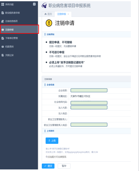 輸入賬號密碼,成功登錄系統(tǒng)后,點擊左側(cè)菜單欄的“企業(yè)注銷申報”模塊,進入管理頁面。企業(yè)提交注銷申請需要上傳“準予注銷登記的通知書”,只允許上傳一張圖片,上傳后可進行“下載”、“刪除”。