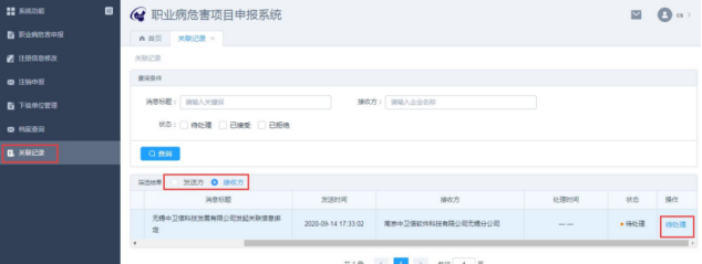 子公司登錄賬號后,點擊左側(cè)菜單欄的“關(guān)聯(lián)記錄”模塊,注意:當(dāng)選擇發(fā)送方篩選時,可查看本單位發(fā)送的關(guān)聯(lián)請求,當(dāng)選擇接收方篩選時,可查看其他單位發(fā)送給本單位的關(guān)聯(lián)請求。點擊“待處理”按鈕,查看關(guān)聯(lián)請求,進一步點擊拒絕,可以拒絕發(fā)送方的關(guān)聯(lián)請求;點擊接受,則可以和發(fā)送方進行單位關(guān)聯(lián)。