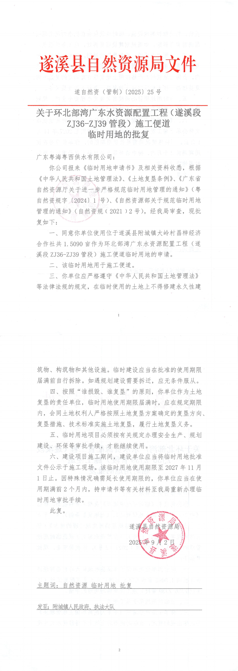 遂自然資(管制)〔2025〕25號 關(guān)于環(huán)北部灣廣東水資源配置工程(遂溪段ZJ36-ZJ39管段)施工便道臨時用地的批復