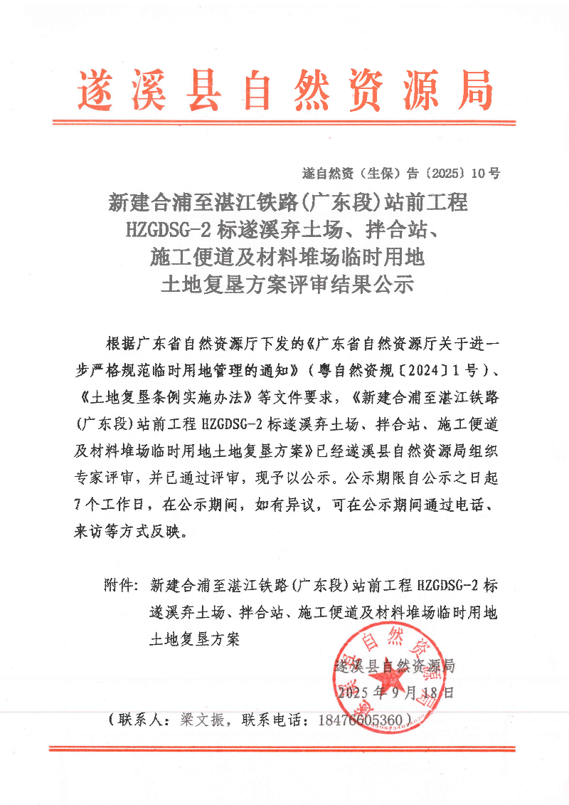 新建合浦至湛江鐵路(廣東段)站前工程HZGDSG-2標遂溪棄土場、拌合站、施工便道及材料堆場臨時用地土地復墾方案評審結果公示