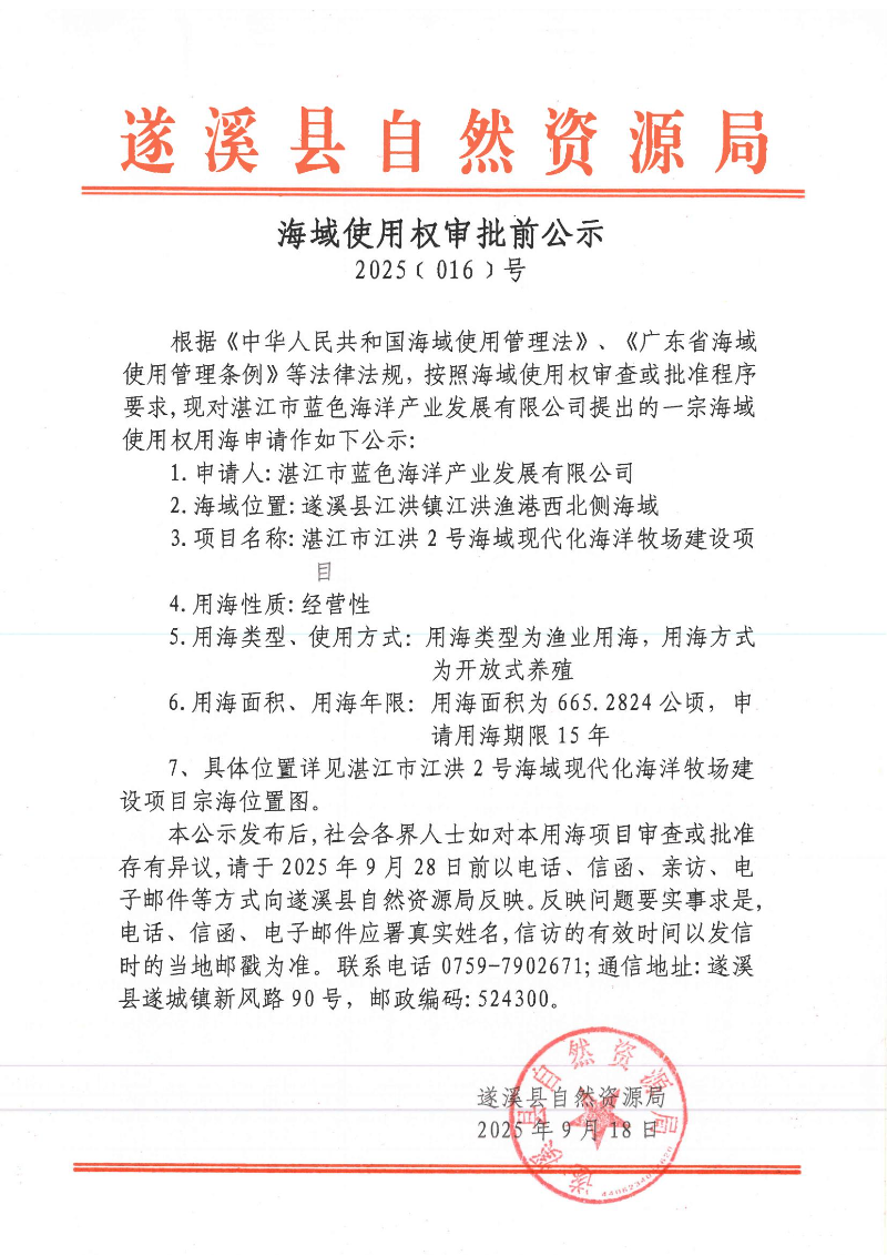 海域使用權(quán)審批前公示 2025﹝016﹞號