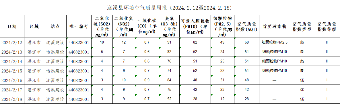 遂溪縣環(huán)境空氣質(zhì)量周報(bào)(2024.2.12至2024.2.18)