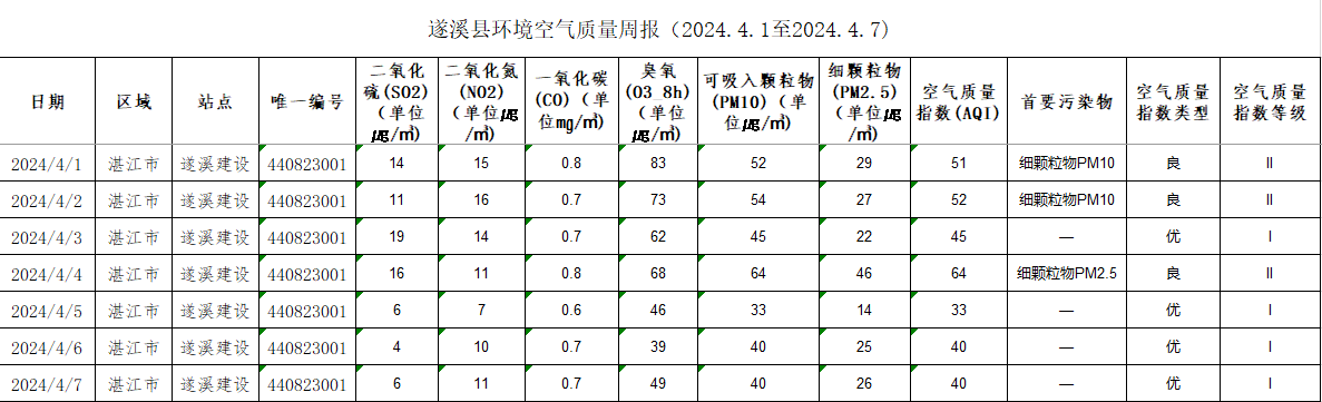 遂溪縣環(huán)境空氣質量周報(2024.4.01至2024.4.07)