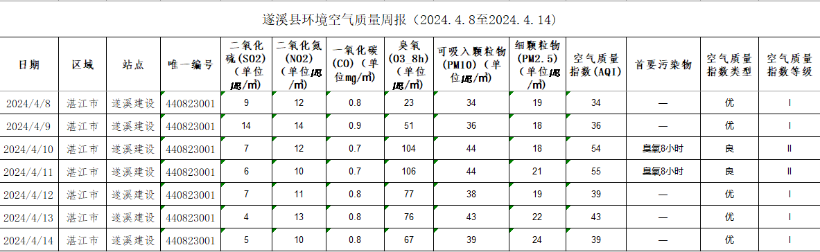 遂溪縣環(huán)境空氣質(zhì)量周報(bào)(2024.4.08至2024.4.14)