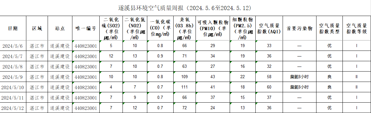 遂溪縣環(huán)境空氣質(zhì)量周報(bào)(2024.5.06至2024.5.12)