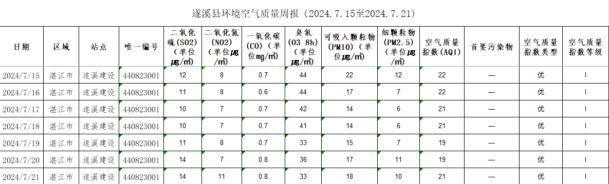遂溪縣環(huán)境空氣質(zhì)量周報(bào)(2024.7.15至2024.7.21)