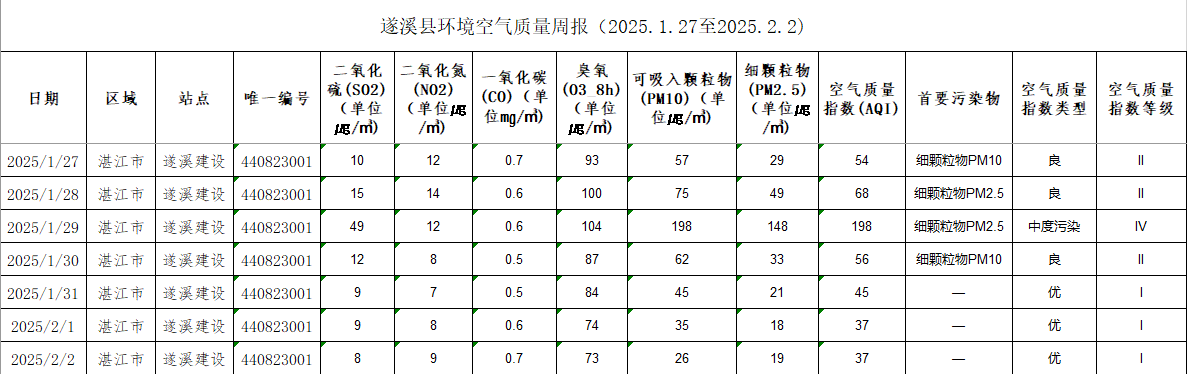 遂溪縣環(huán)境空氣質(zhì)量周報(bào)(2025.1.27至2025.2.2)