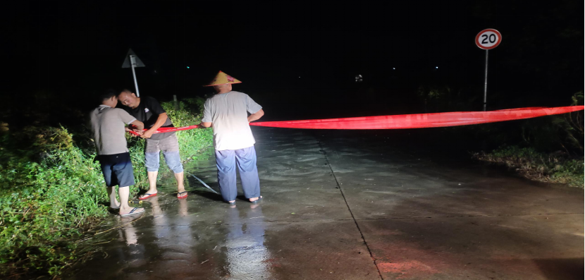 ?。ㄐ艓X村黨支部連夜組織黨員在鐵路涵洞淹水處拉設(shè)警戒線,保障群眾出行安全)