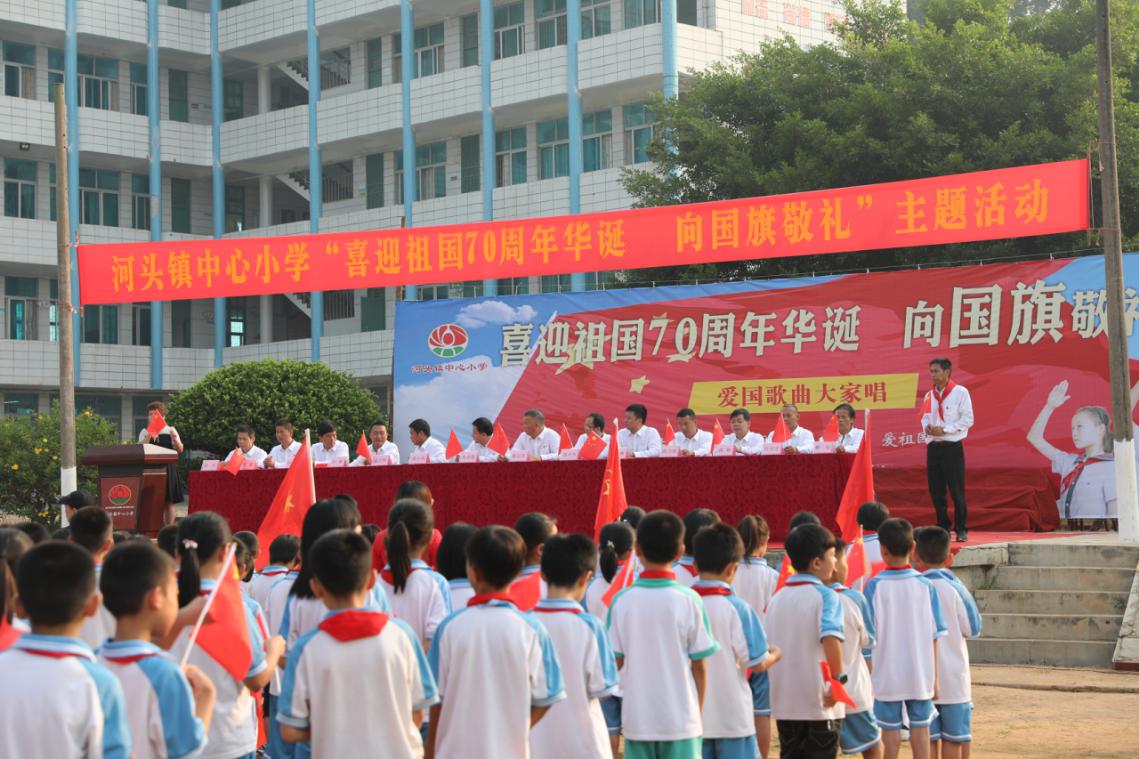 河頭中心小學(xué)舉行“喜迎新中國成立70周年,向國旗敬禮”的主題活動,由“國旗在我心中”、“責(zé)任在心,播種最美最新篇章”、“解讀國旗,認(rèn)識國旗”、“發(fā)奮圖強(qiáng),共筑中國夢”、“童心向黨合唱展演”、“與祖國同命運,同唱《我和我的祖國》”七個篇章組成,氣勢恢宏的大合唱,盛世鼓舞情景。校園歌聲嘹亮,充滿喜氣,處處洋溢著師生同慶新中國成立70周年華誕氛圍!陳石生校長莊嚴(yán)站在國旗下,鄭重地與全體師生分享了中國的滄桑歲月、富強(qiáng)的新時代。警醒師生:“國家興亡,匹夫有責(zé)”,要求全體學(xué)生、少先隊員要扣好人生第一粒扣子,奮發(fā)圖強(qiáng),加強(qiáng)科學(xué)理論知識學(xué)習(xí)和社會實踐活動歷練,做好祖國事業(yè)建設(shè)的“后備軍”。由學(xué)生表演的“童心向黨”節(jié)目,以《沒有共產(chǎn)黨就沒有新中國》歌曲伴奏進(jìn)行表演,獲得全場人員一片的掌聲。