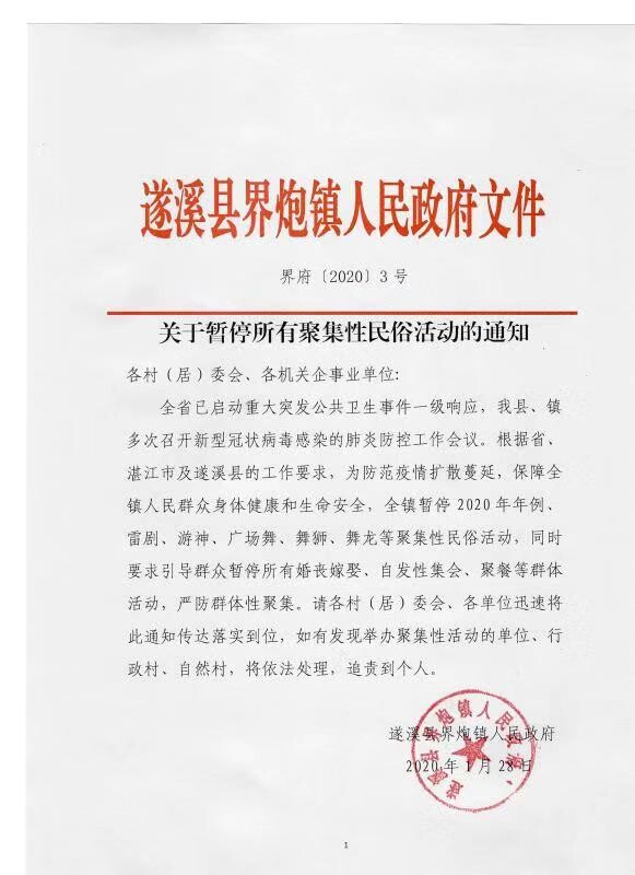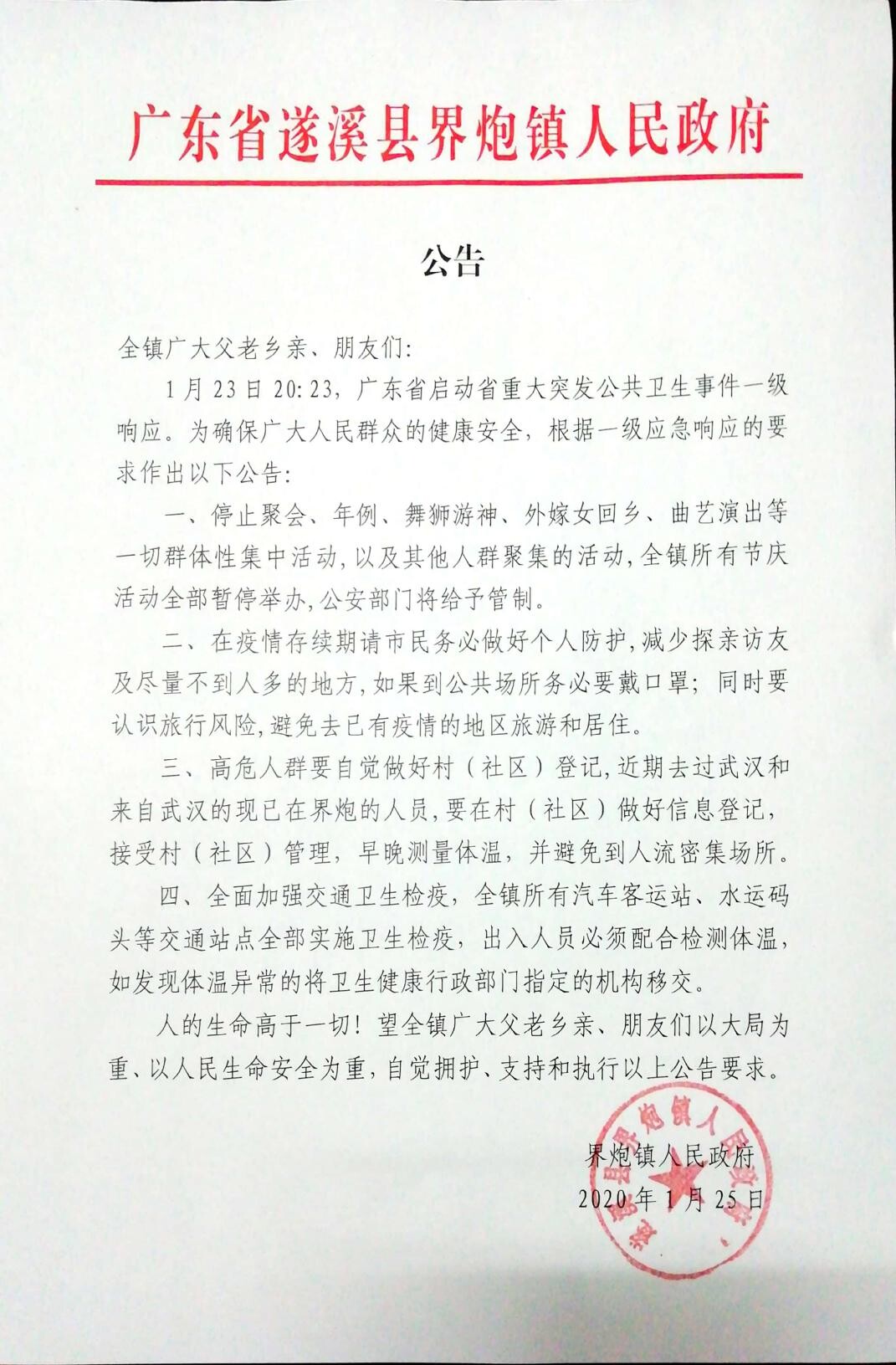 當(dāng)前,廣東省疫情形勢(shì)十分嚴(yán)峻、防控工作任務(wù)艱巨。1月23日,廣東省已啟動(dòng)重大突發(fā)公共衛(wèi)生事件一級(jí)響應(yīng)(最高級(jí)別防控措施)。疫情就是命令,防控就是責(zé)任。要把人民群眾生命安全和身體健康放在第一位,把疫情防控工作作為當(dāng)前最重要的工作來(lái)抓。要堅(jiān)定信心、同舟共濟(jì)、科學(xué)防治、精準(zhǔn)施策,堅(jiān)決打贏疫情防控阻擊戰(zhàn)。界炮鎮(zhèn)新型冠狀病毒肺炎疫情群防群控、聯(lián)防聯(lián)控局面已經(jīng)形成。