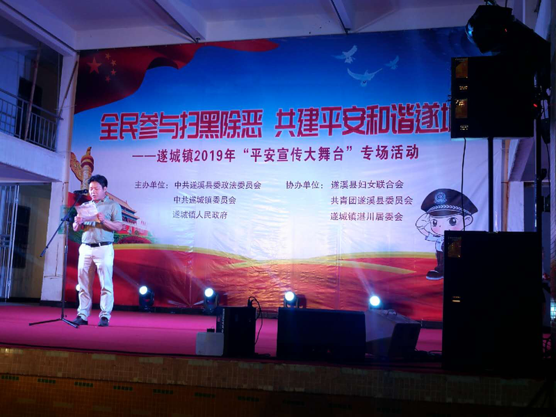 為加強全民參與掃黑除惡宣傳力度,維護社會和諧穩(wěn)定,共建平安和諧遂溪。4月26日晚上8點,由縣政法委、縣婦聯(lián)、縣共青團、遂城鎮(zhèn)委鎮(zhèn)政府等單位聯(lián)合舉辦的遂城鎮(zhèn)2019年“平安宣傳大舞臺”專場活動在遂城鎮(zhèn)湛川文化廣場隆重舉行。
