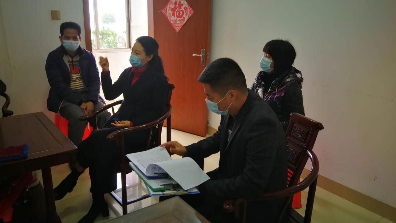張閩英副縣長(zhǎng)(左二)在聽(tīng)取疫情防控情況匯報(bào)。