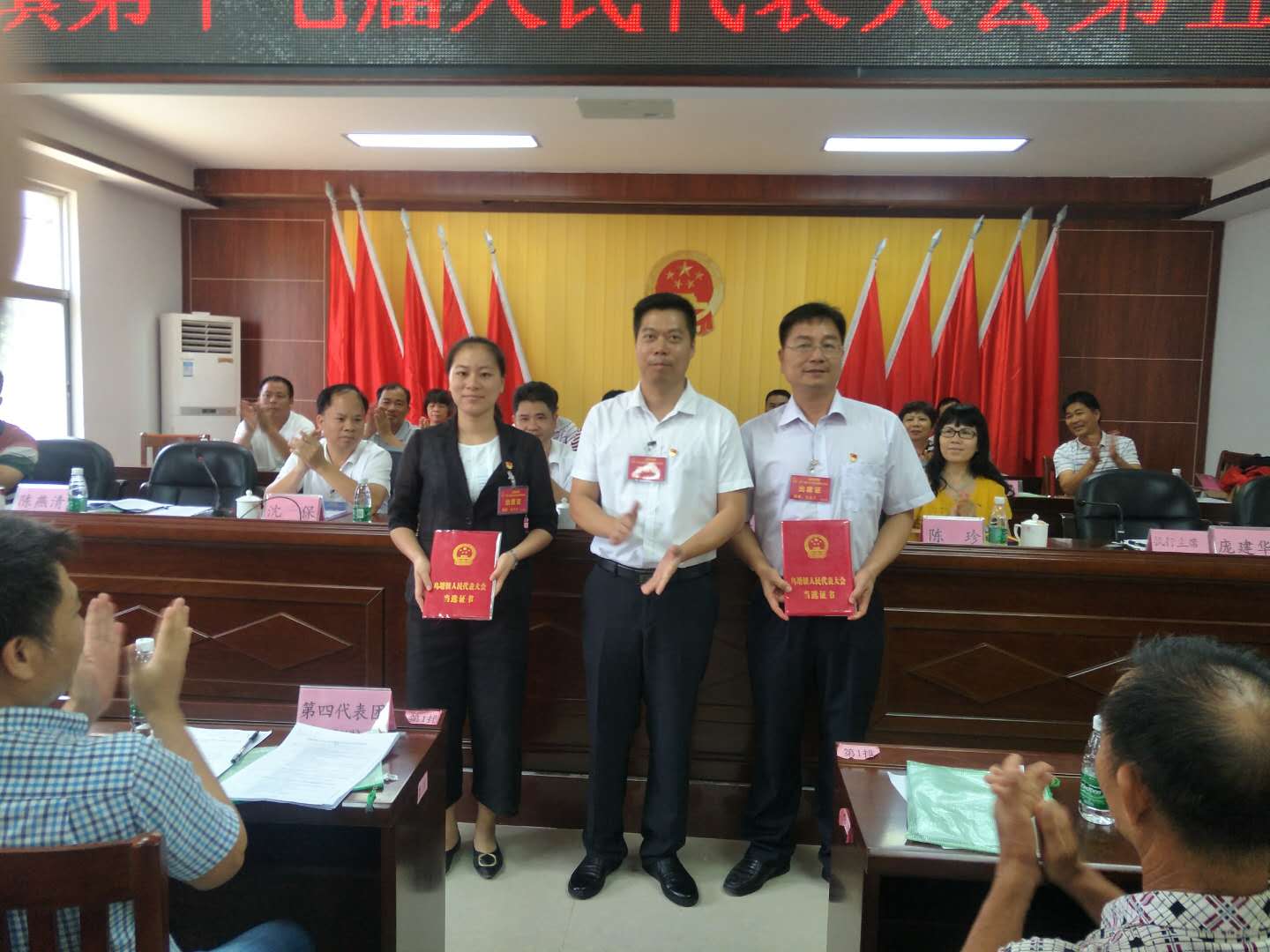 ??? (鎮(zhèn)黨委負(fù)責(zé)人梁李興(中)為新當(dāng)選烏塘鎮(zhèn)鎮(zhèn)長陳燕清(左)