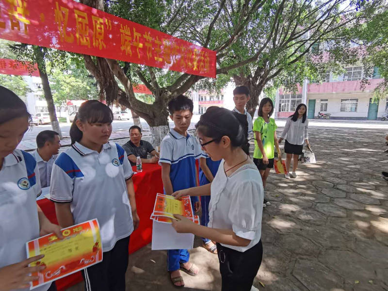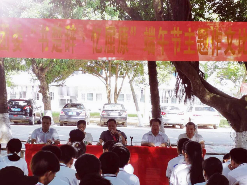 楊柑團(tuán)鎮(zhèn)委于2020年6月23日上午在楊柑二中大會(huì)場(chǎng)舉行“書楚辭 憶屈原”端午節(jié)主題作文比賽頒獎(jiǎng)典禮。頒獎(jiǎng)典禮由楊柑二中校長(zhǎng)周蝶主持,楊柑鎮(zhèn)黨委副書記袁偉強(qiáng)、楊柑鎮(zhèn)團(tuán)委書記李思萍出席典禮并為獲獎(jiǎng)學(xué)生頒獎(jiǎng),龍眼初中師生代表、楊柑二中全體學(xué)生等400余人參加了頒獎(jiǎng)典禮。