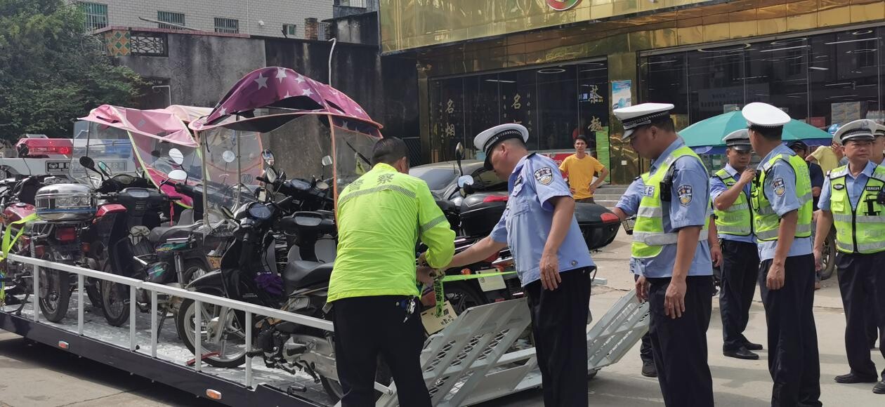 圖為執(zhí)法人員查扣違法摩托車、電動車