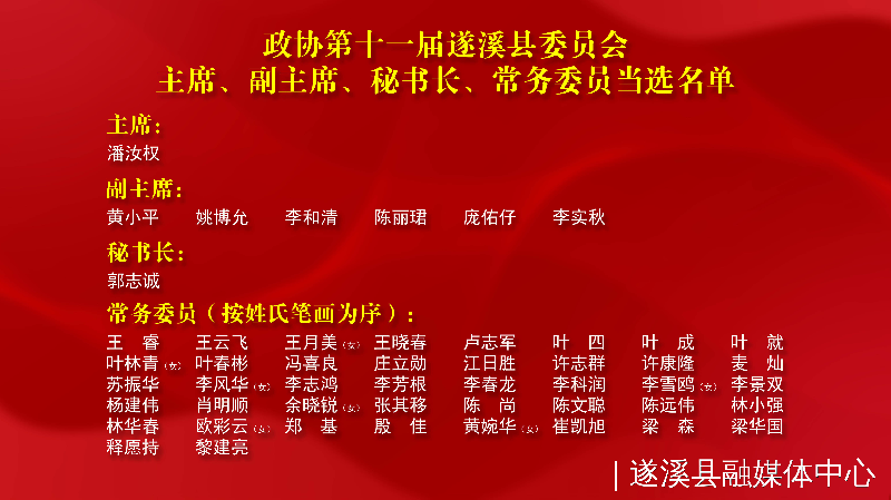 大會(huì)閉幕前,政協(xié)第十一屆遂溪縣委員會(huì)第一次會(huì)議召開第二次全體委員會(huì)議,大會(huì)通過無記名投票選舉政協(xié)第十一屆遂溪縣委員會(huì)主席1名、副主席6名、秘書長(zhǎng)1名,常務(wù)委員42名。