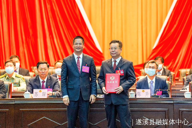 遂溪縣委書記駱華慶為新當(dāng)選的政協(xié)第十一屆遂溪縣委員會(huì)主席潘汝權(quán)頒發(fā)當(dāng)選證書。