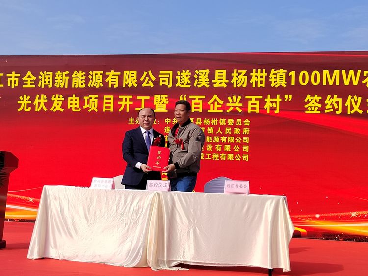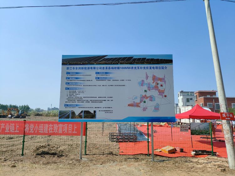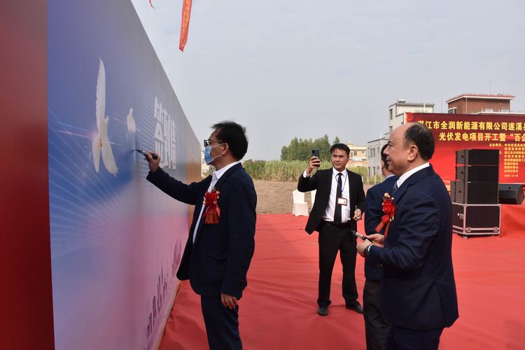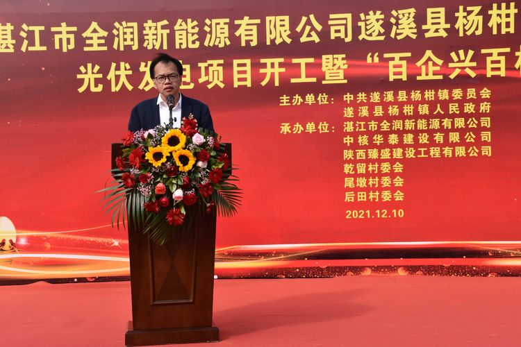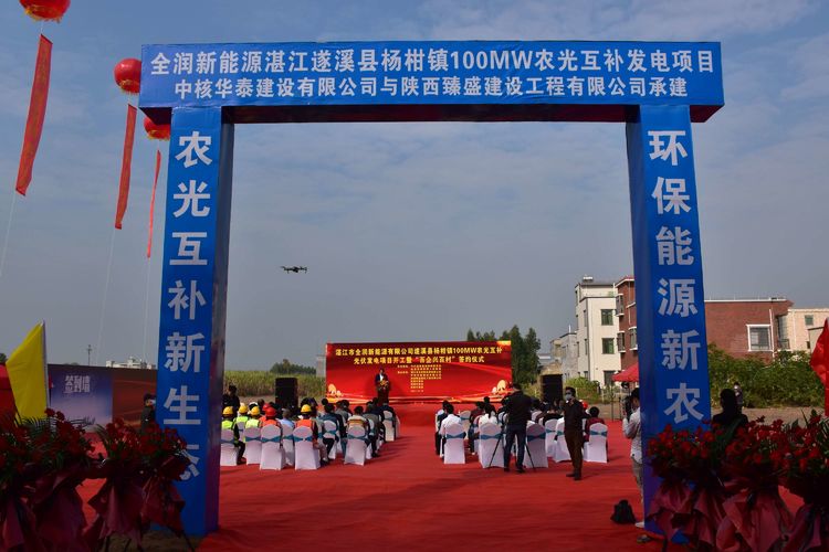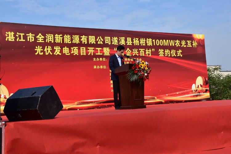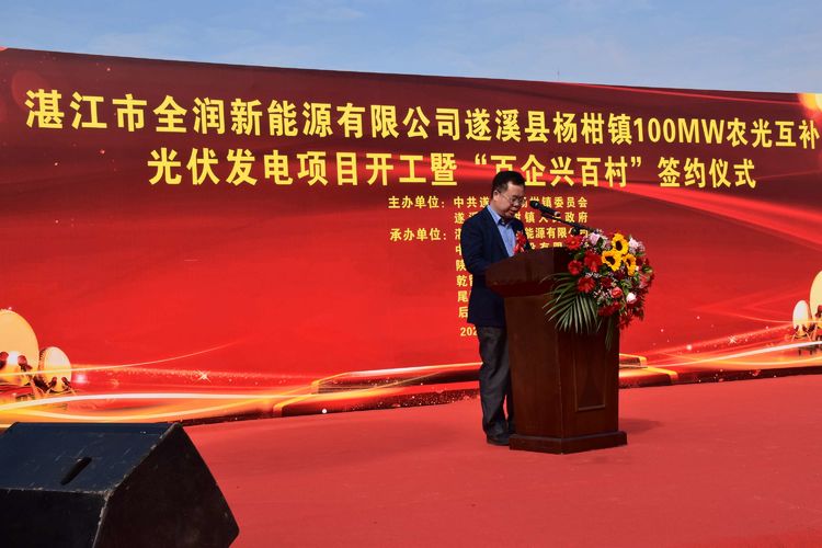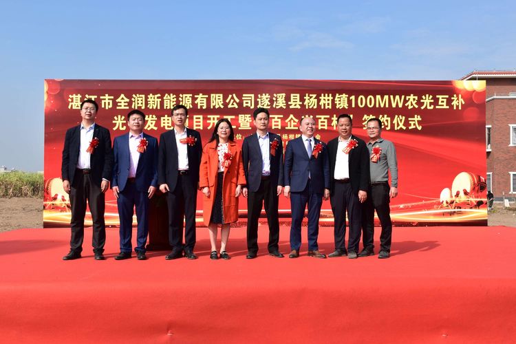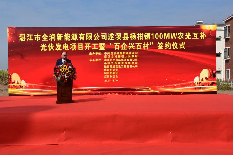 2021年12月10日,湛江市全潤新能源有限公司遂溪縣楊柑鎮(zhèn)100MW農(nóng)光互補(bǔ)光伏發(fā)電項(xiàng)目開工暨“百企興百村”簽約儀式在尾墩村委會(huì)田頭新村舉行。這是楊柑鎮(zhèn)委鎮(zhèn)政府貫徹落實(shí)中央和省市縣碳達(dá)峰碳中和決策部署的行動(dòng)舉措,也是楊柑鎮(zhèn)實(shí)施鄉(xiāng)村振興戰(zhàn)略推進(jìn)駐鎮(zhèn)幫鎮(zhèn)扶村工作的又一重大成果。