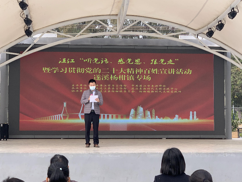 宣講活動(dòng)上,鎮(zhèn)黨委委員、紀(jì)委書記李思聰作活動(dòng)致辭,湛江市百姓宣講員用“百姓話”講“百姓事”,通過講遂溪鄉(xiāng)村振興故事《黨建強(qiáng)、產(chǎn)業(yè)興、農(nóng)民富+洋青火龍果之歌》、依法治國《堅(jiān)持以人民為中心,不斷提高人民群眾獲得感幸福感安全感》、《奉獻(xiàn)國防,投身強(qiáng)軍》,快板《贊頌黨的二十大》,粵曲《奮進(jìn)新征程》,通俗易懂的語言,鮮活生動(dòng)的事例,多領(lǐng)域、多渠道開展繪聲繪色宣講,沾泥土、帶露珠、冒熱氣,推動(dòng)黨的二十大精神“聲”入人心。