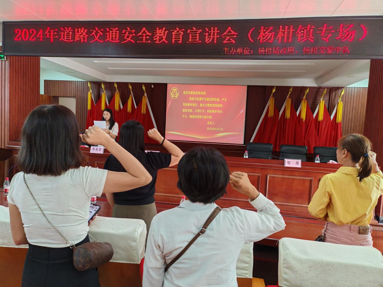接著,由楊柑鎮(zhèn)交警中隊(duì)副隊(duì)長(zhǎng)李裕春通過(guò)播放交通安全視頻結(jié)合交通事故案例的講解,向參會(huì)人員普及了交通安全知識(shí),讓大家意識(shí)到交通安全的重要性,提高了大家的安全意識(shí),引導(dǎo)自覺(jué)遵守交通規(guī)則,共同營(yíng)造一個(gè)安全、文明、和諧的交通環(huán)境。隨后,全體參會(huì)人員作了道路交通安全承諾宣誓。