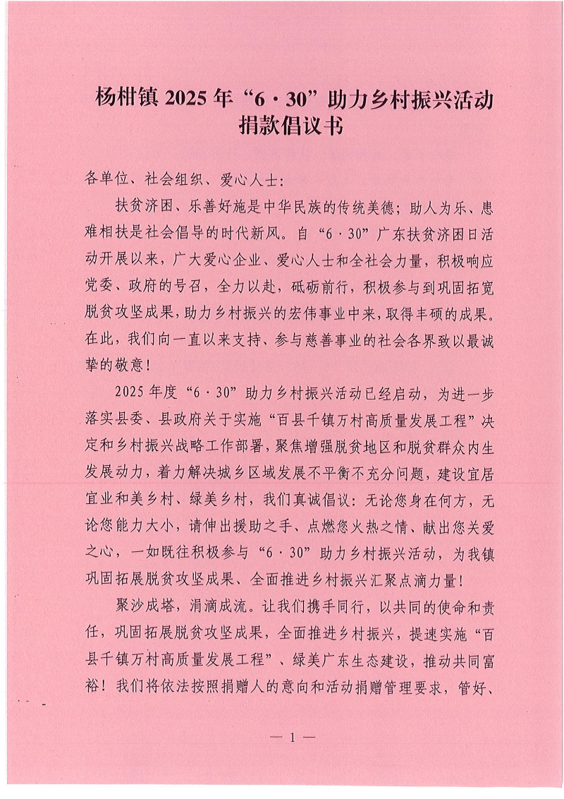 楊柑鎮(zhèn)2025年“6·30”助力鄉(xiāng)村振興活動(dòng)捐款倡議書(shū)