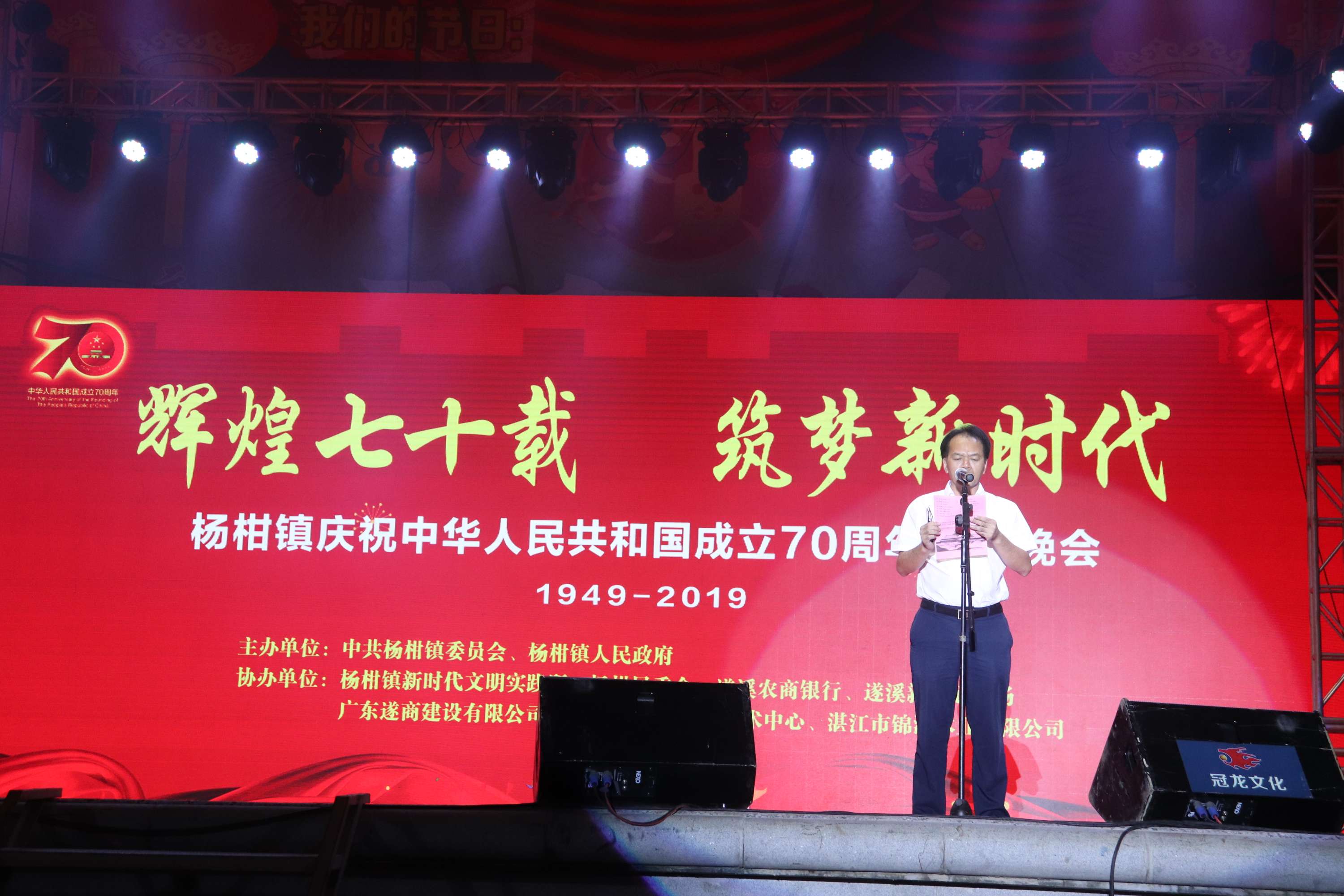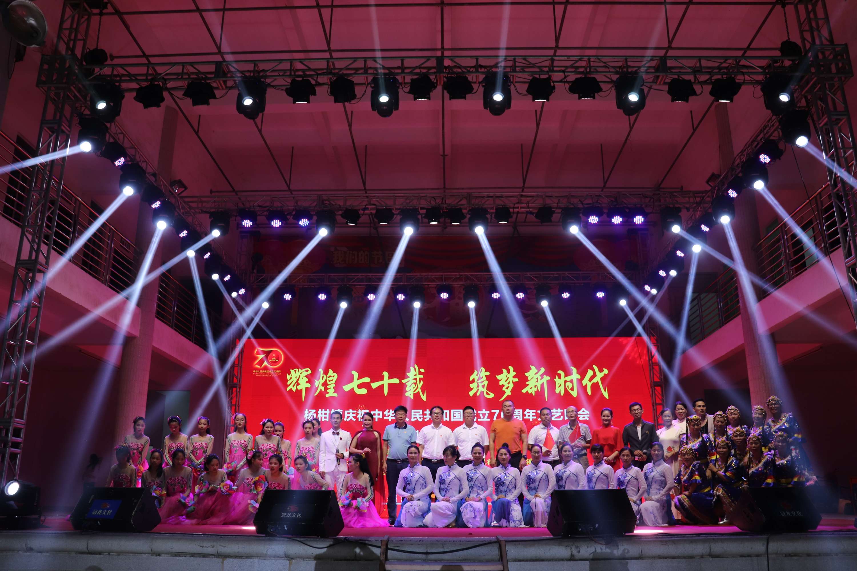 9月30日晚,由中共楊柑鎮(zhèn)委員會、楊柑鎮(zhèn)人民政府主辦的“輝煌七十載,筑夢新時代”慶祝中華人民共和國成立70周年文藝晚會在楊柑圩文化樓隆重舉行,鎮(zhèn)領(lǐng)導(dǎo)班子成員、各機(jī)關(guān)單位、村(居)委會領(lǐng)導(dǎo)干部以及廣大人民群眾逾2000人歡聚一堂,載歌載舞,共賀祖國70華誕。