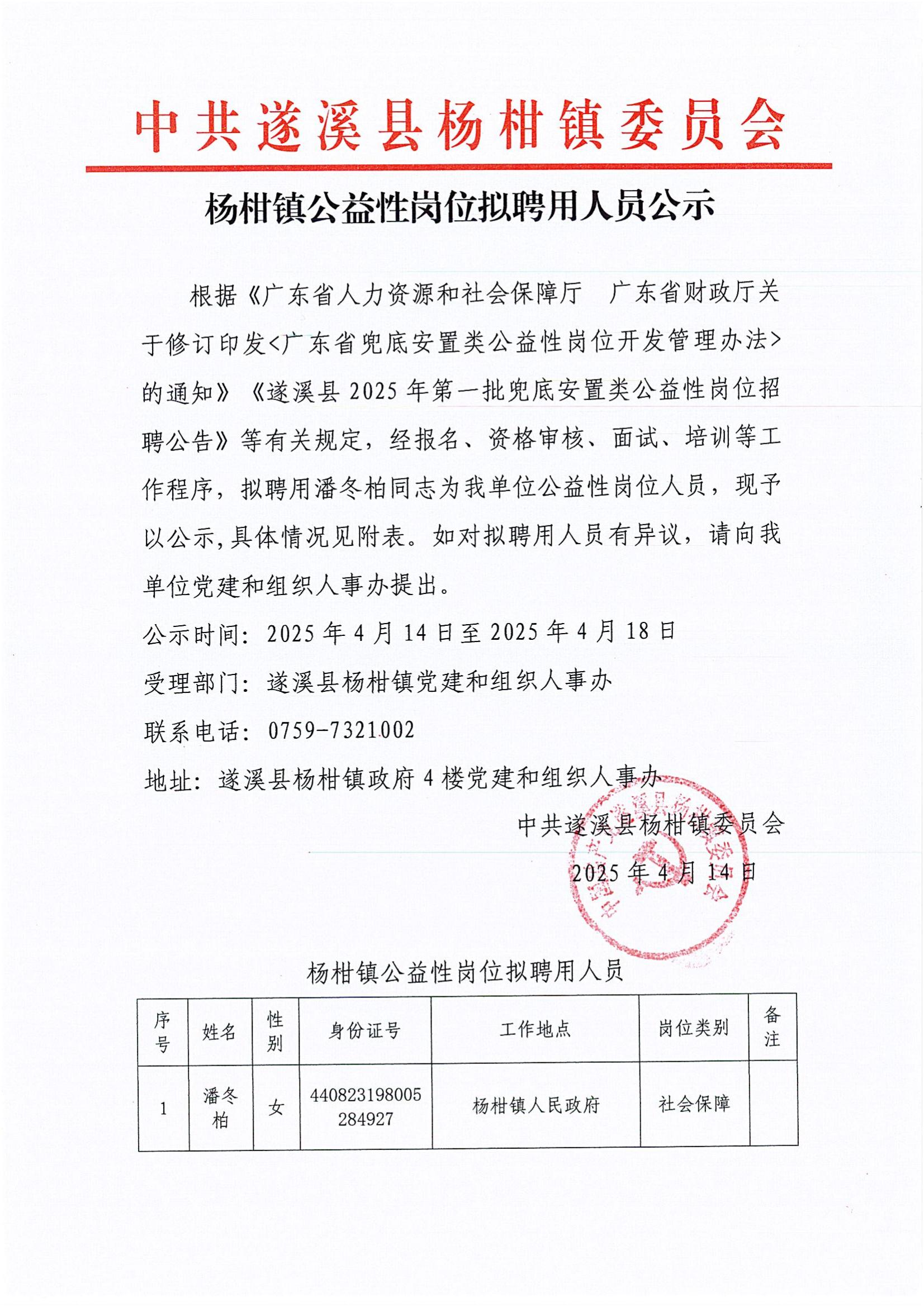 楊柑鎮(zhèn)公益性崗位擬聘用人員公示