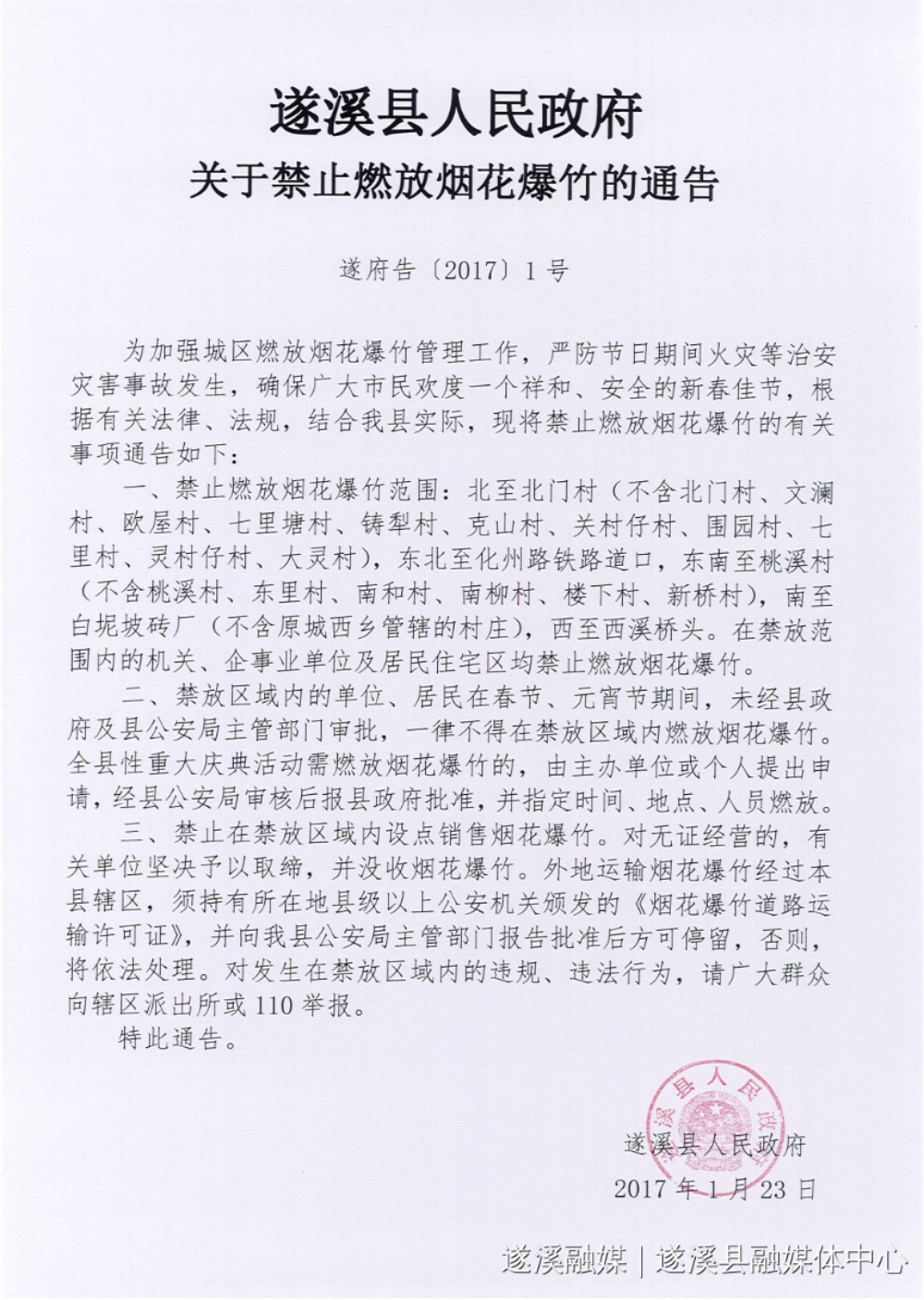 為進(jìn)一步加強(qiáng)我縣春節(jié)期間煙花爆竹燃放管控工作,根據(jù)市、縣有關(guān)工作部署及要求,和遂溪縣污染防治攻堅(jiān)戰(zhàn)指揮部辦公室《關(guān)于印發(fā)<遂溪縣2021年春節(jié)期間煙花爆竹燃放管控工作方案>的通知》精神,現(xiàn)將遂溪縣人民政府《關(guān)于禁止燃放煙花爆竹的通告》轉(zhuǎn)發(fā)如下: