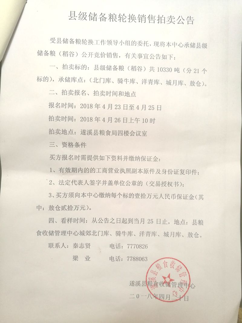 縣級(jí)儲(chǔ)備糧輪換銷售拍賣公告(2018年4月)