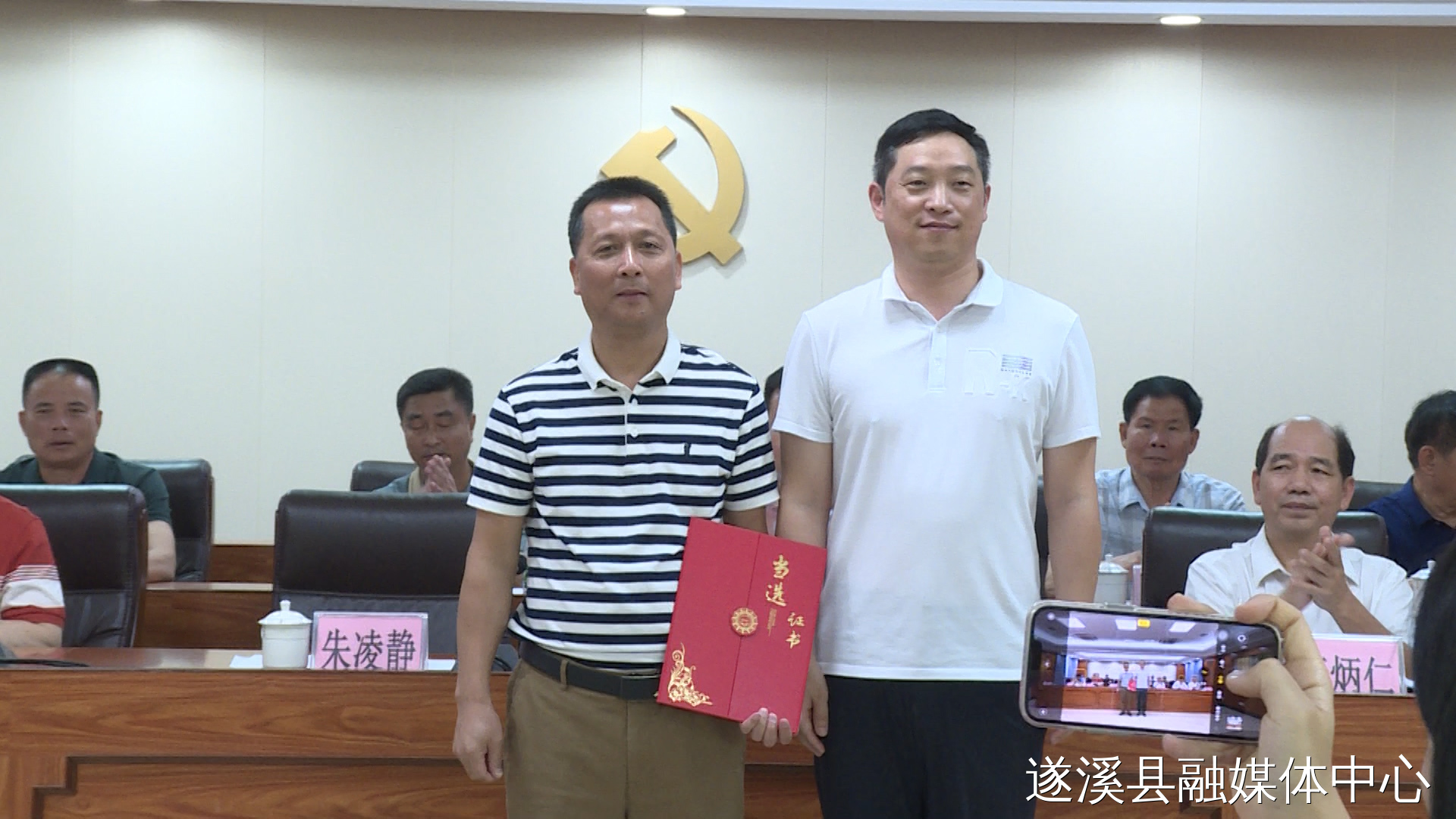 遂溪縣委常委、統(tǒng)戰(zhàn)部部長(zhǎng)朱凌靜等為當(dāng)選的各位成員頒發(fā)證書,并為洋青鎮(zhèn)商會(huì)揭牌。