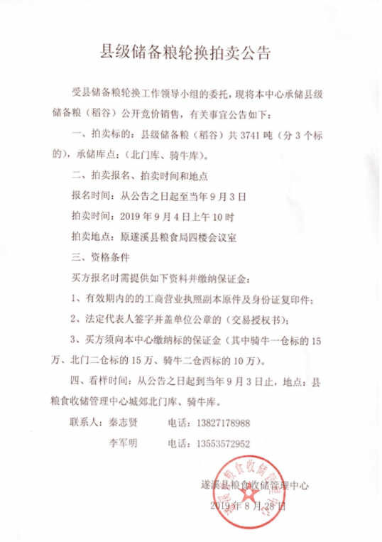 縣級儲備糧輪換銷售拍賣公告2019.8