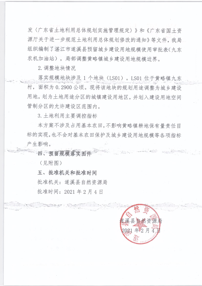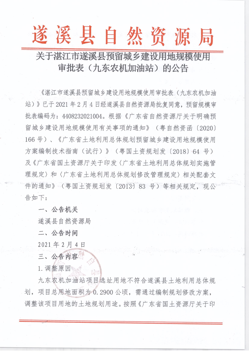 關(guān)于湛江市遂溪縣預(yù)留城鄉(xiāng)建設(shè)用地規(guī)模使用審批表(九東農(nóng)機(jī)加油站)的公告